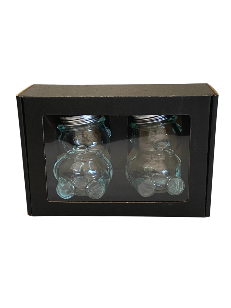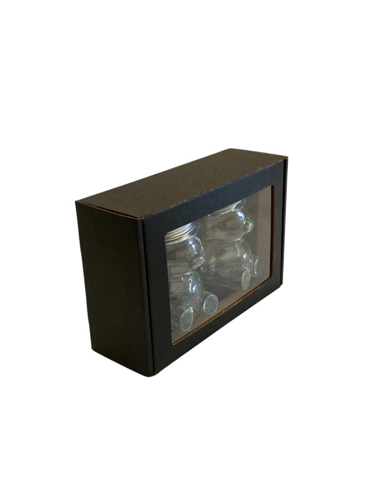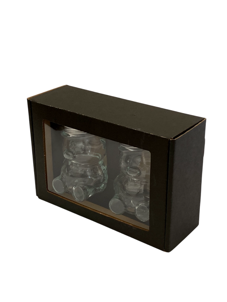 Toto balenie je určené na darčekové alebo prezentačné účely. Pojme 2 kusy sklenených pohárov v tvare medvedíka s objemom 220 g medu (typ MACKO10).