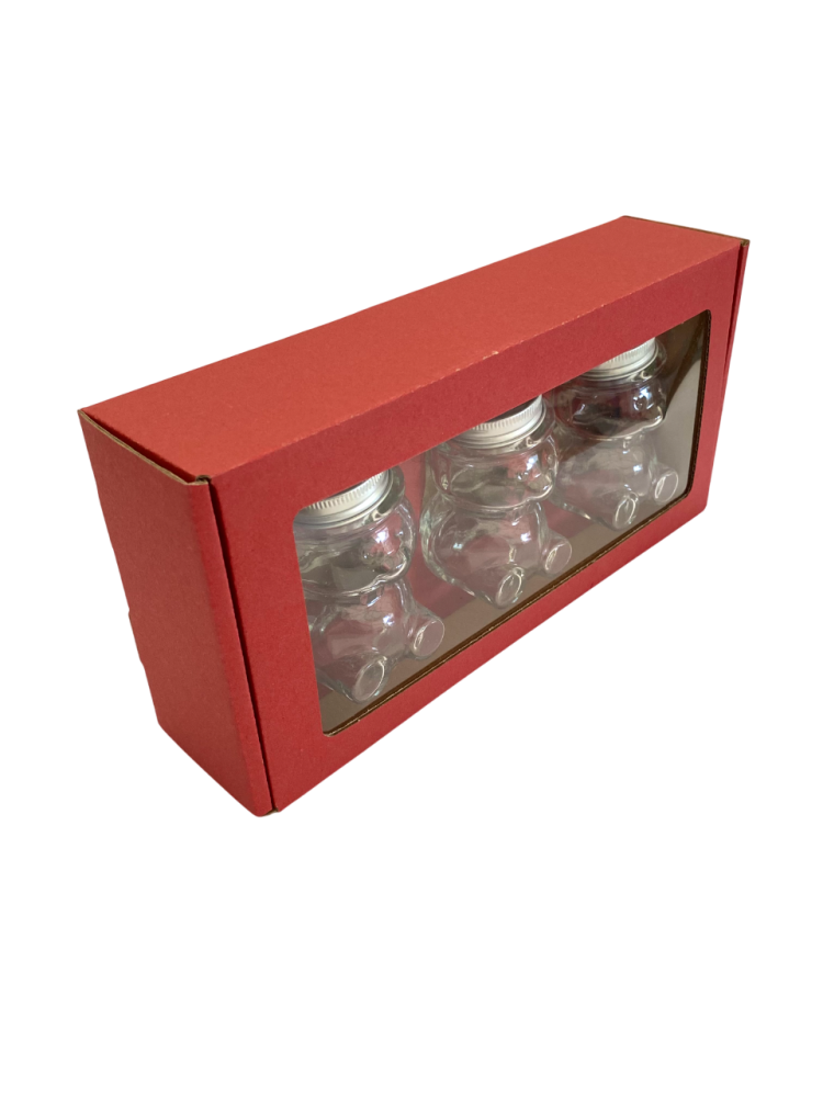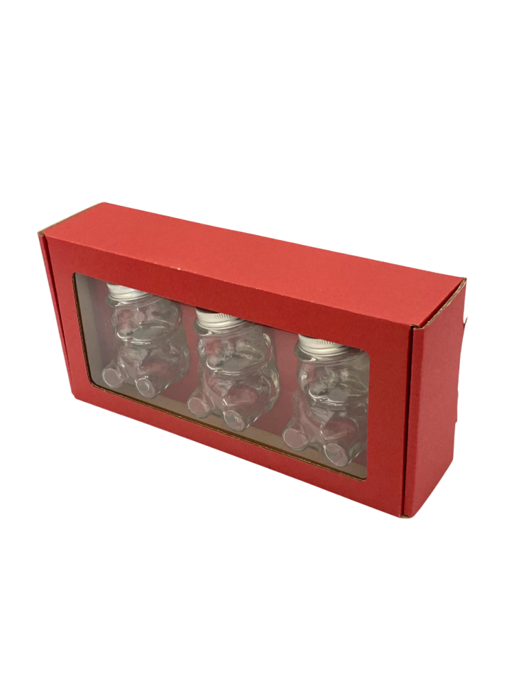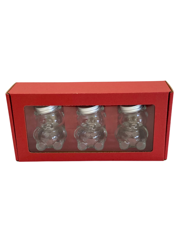 Toto balenie je určené na darčekové alebo prezentačné účely. Pojme 3 kusy sklenených pohárov v tvare medvedíka s objemom 100 g medu (typ MACKO10).