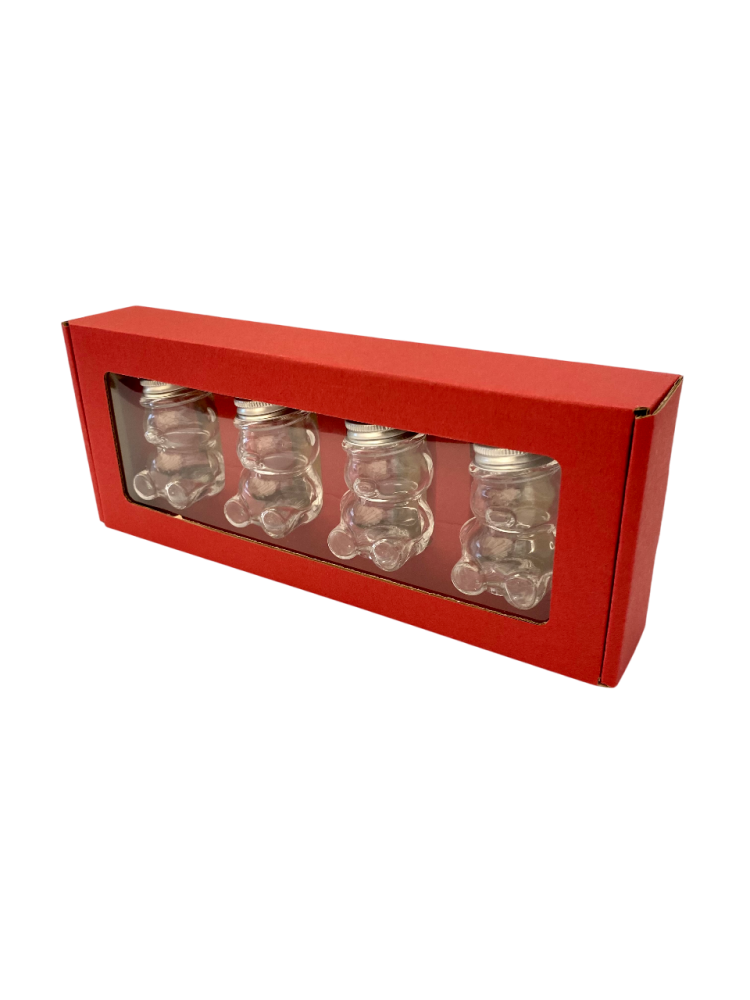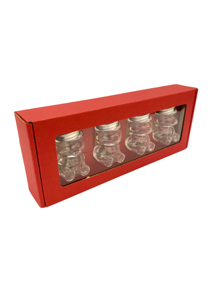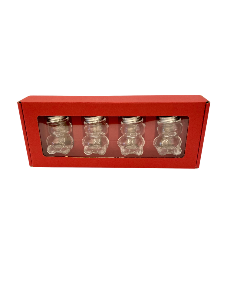 Toto balenie je určené na darčekové alebo prezentačné účely. Pojme 4 kusy sklenených pohárov v tvare medvedíka s objemom 50 g (typ MACKO5).