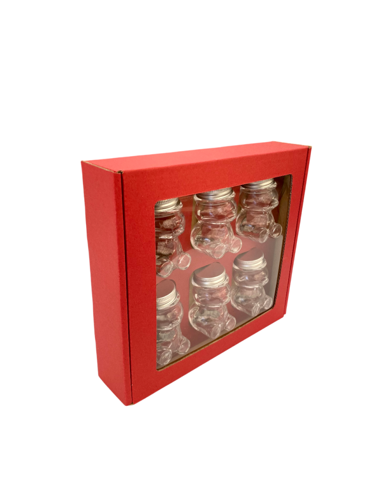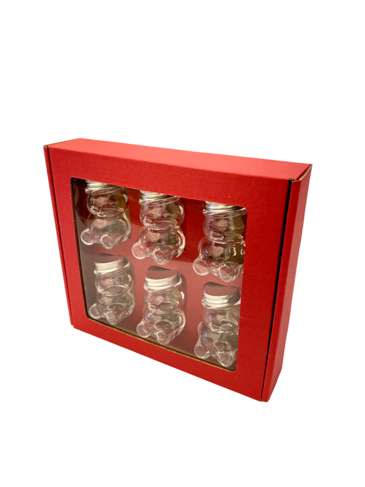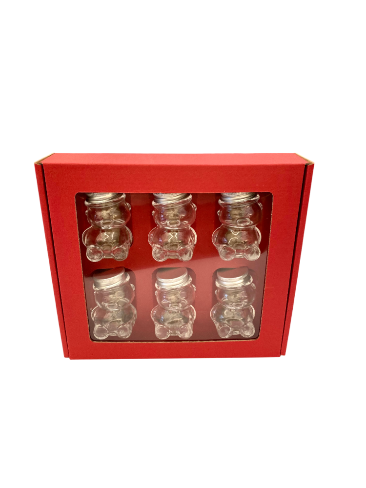Toto balenie je určené na darčekové alebo prezentačné účely. Pojme 6 kusov sklenených pohárov v tvare medvedíka s objemom 50 g (typ MACKO5).