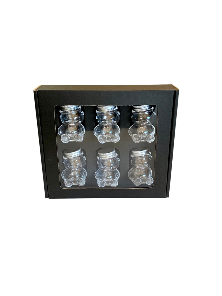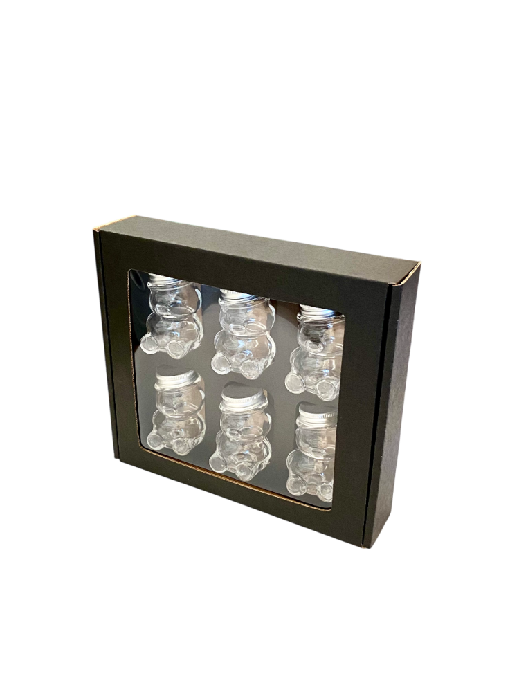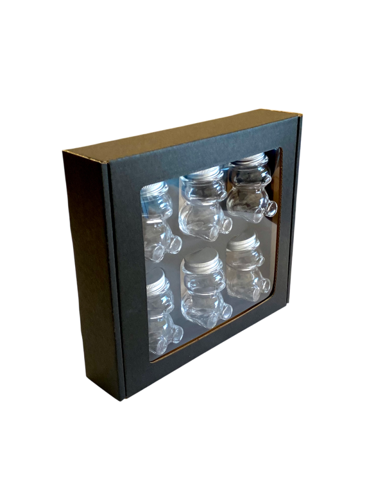 Toto balenie je určené na darčekové alebo prezentačné účely. Pojme 6 kusov sklenených pohárov v tvare medvedíka s objemom 50 g (typ MACKO5).