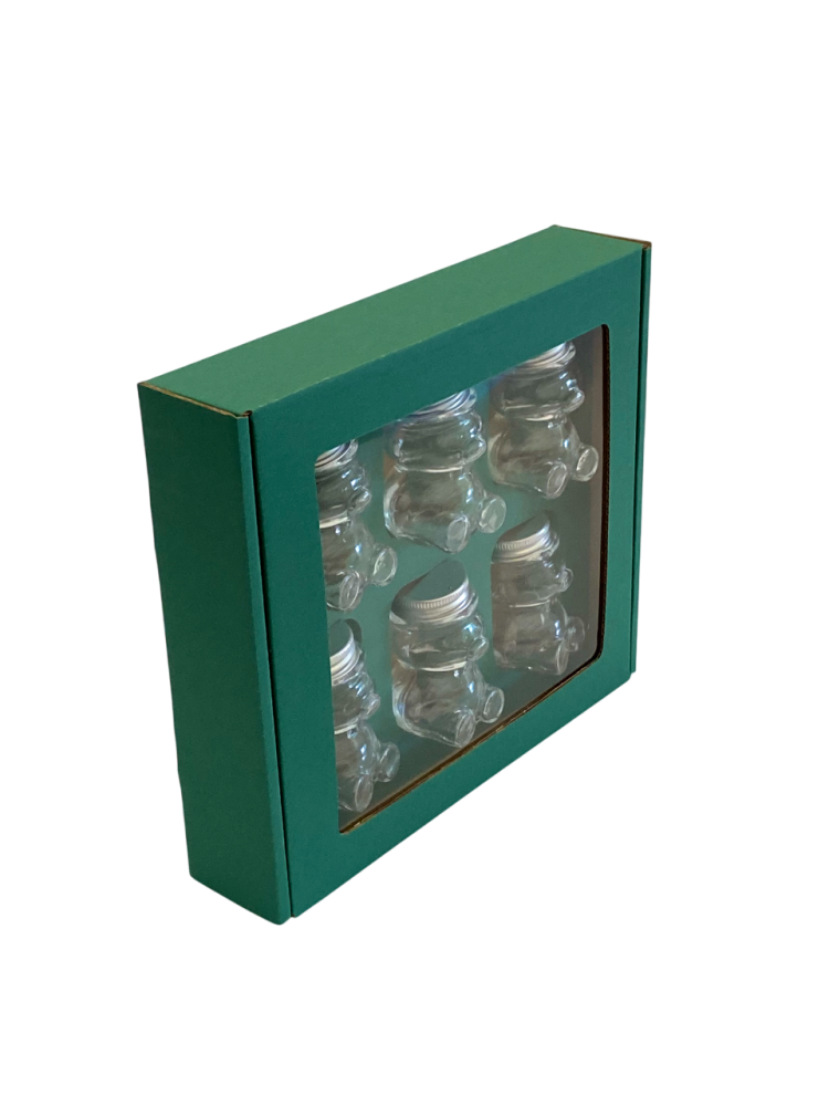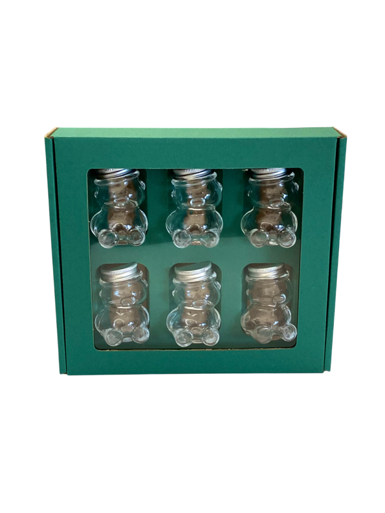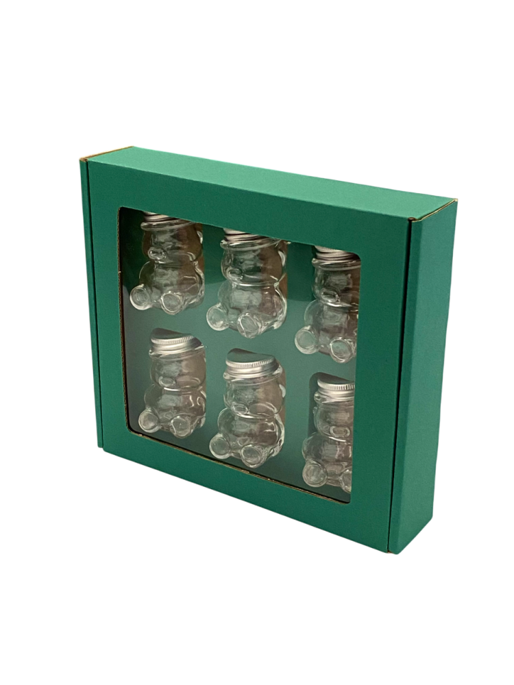 Toto balenie je určené na darčekové alebo prezentačné účely. Pojme 6 kusov sklenených pohárov v tvare medvedíka s objemom 50 g (typ MACKO5).