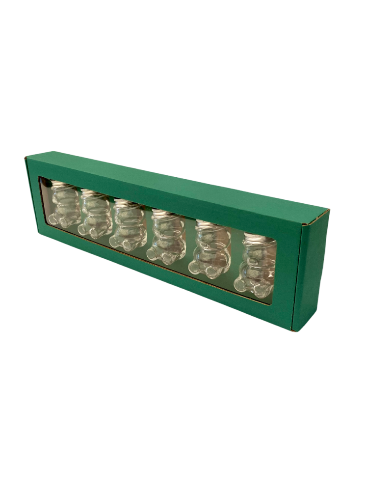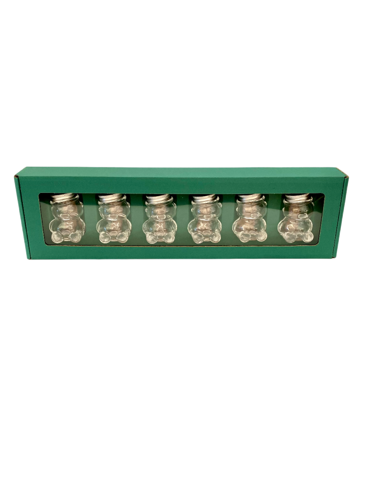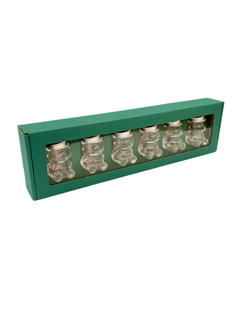 Toto balenie je určené na darčekové alebo prezentačné účely. Pojme 6 kusov sklenených pohárov v tvare medvedíka s objemom 50 g (typ MACKO5).