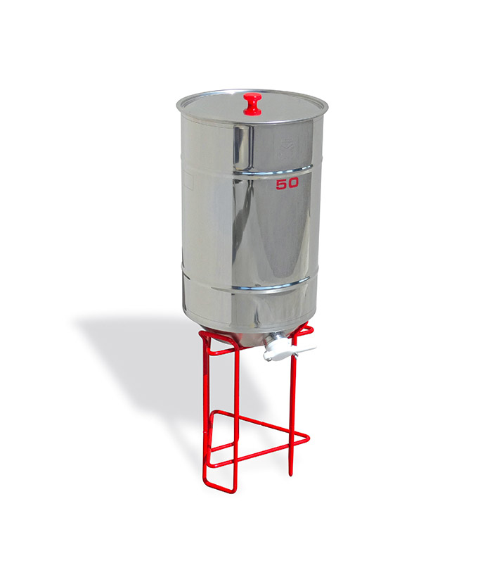 z nehrdzavejúcej ocele, O 310 mm, výška 527 mm, s nerezovým výpustným ventilom na med a plne vyprázdniteľným dnom.Usadzovacie nádoby „ZERO“ z nehrdzavejúcej ocele AISI 304 majú špeciálne tvarované dno s úplným odtokom, ktoré umožňuje nastaviť výpustný ventil na najnižšom bode dna, čím sa zabezpečí úplné vyprázdnenie medu z nádoby. Kovový stojan je nevyhnutný pre stabilitu nádoby.